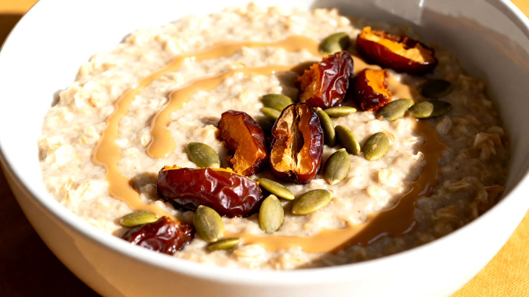 Datteln mögen zunächst wie eine reine Zuckerquelle erscheinen, doch ihre Ballaststoffe und die Kombination mit den anderen Zutaten verändern ihre Wirkung grundlegend. Der glykämische Index der gesamten Mahlzeit bleibt moderat, obwohl die natürliche Süße der Datteln das Porridge angenehm aromatisch macht. Kürbiskerne runden das Nährstoffprofil ab und bringen mit ihrem hohen Magnesiumgehalt Unterstützung für über 300 enzymatische Reaktionen im Körper, darunter die Energieproduktion auf zellulärer Ebene.